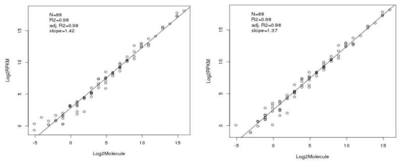 RNA across different samples exhibit a high correlation value between the concentration of the ERCC RNA control and the normalized sequencing reads, demonstrating high fidelity and repeatability of the procedures performed by Otogenetics.