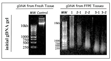 Otogenetics uses gel electrophoresis and spectrophotometer assays to assess the quality of initial gDNA. DNA from fresh tissues appears as a large molecular weight band above 10Kb on the gel. gDNA from FFPE samples have various appearances on the gel depending on how fixation was done, how gDNA extraction was performed, and how well gDNAs were stored after purification. The best ones appear as smears across from low to high molecular weight species, some appear as medium-size smears, and some as low molecular weight smears only. QC of gDNA from FFPE tissues were categorized into Grades 1, 2, and 3 based on original smear appearance and PCR QC, as demonstrated in our downloadable white paper.