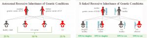 X-linked recessive: The gene is located on X chromosome, for which females have two X chromosomes while males have one X chromosome and one Y chromosome. In X-linked recessive inheritance, a female with one damaged copy of the gene in each cell is called a carrier. She can pass on the altered gene but usually does not experience signs and symptoms of the disorder. When one altered copy of the gene is inherited from an unaffected carrier mother, the male child will have the disease. There is a 50% chance that a baby will inherit the X chromosome with the altered X-linked gene from the mother; females who inherit the altered X-linked gene will be carriers, males who inherit the altered X-linked gene will be affected.